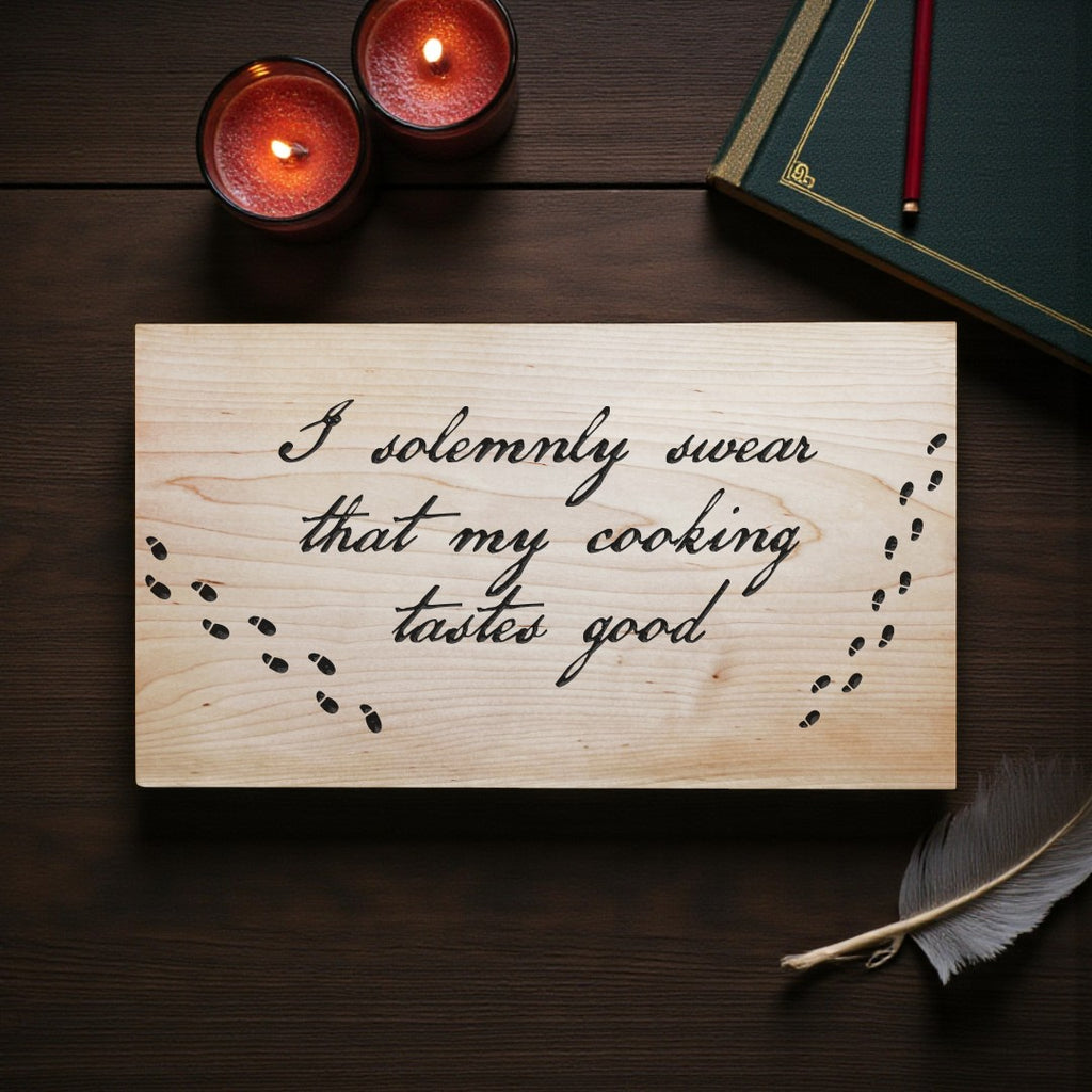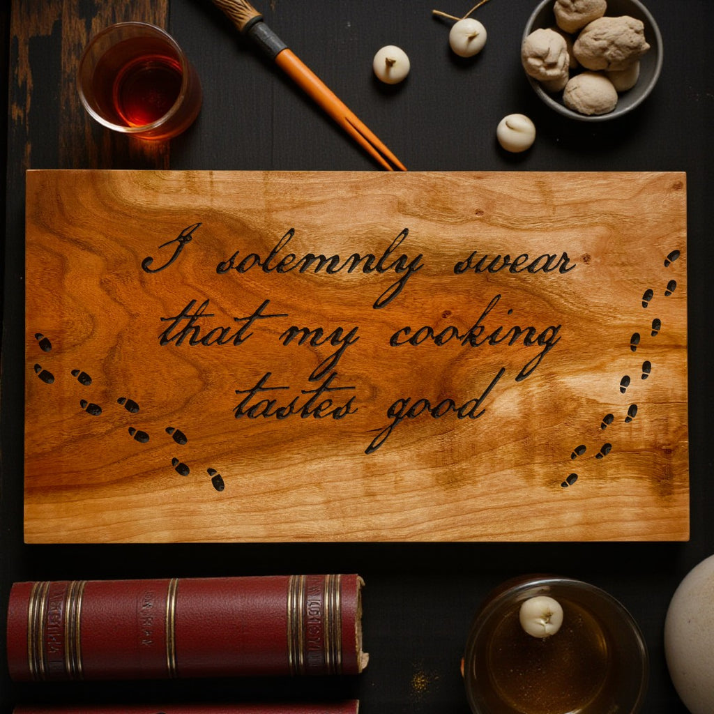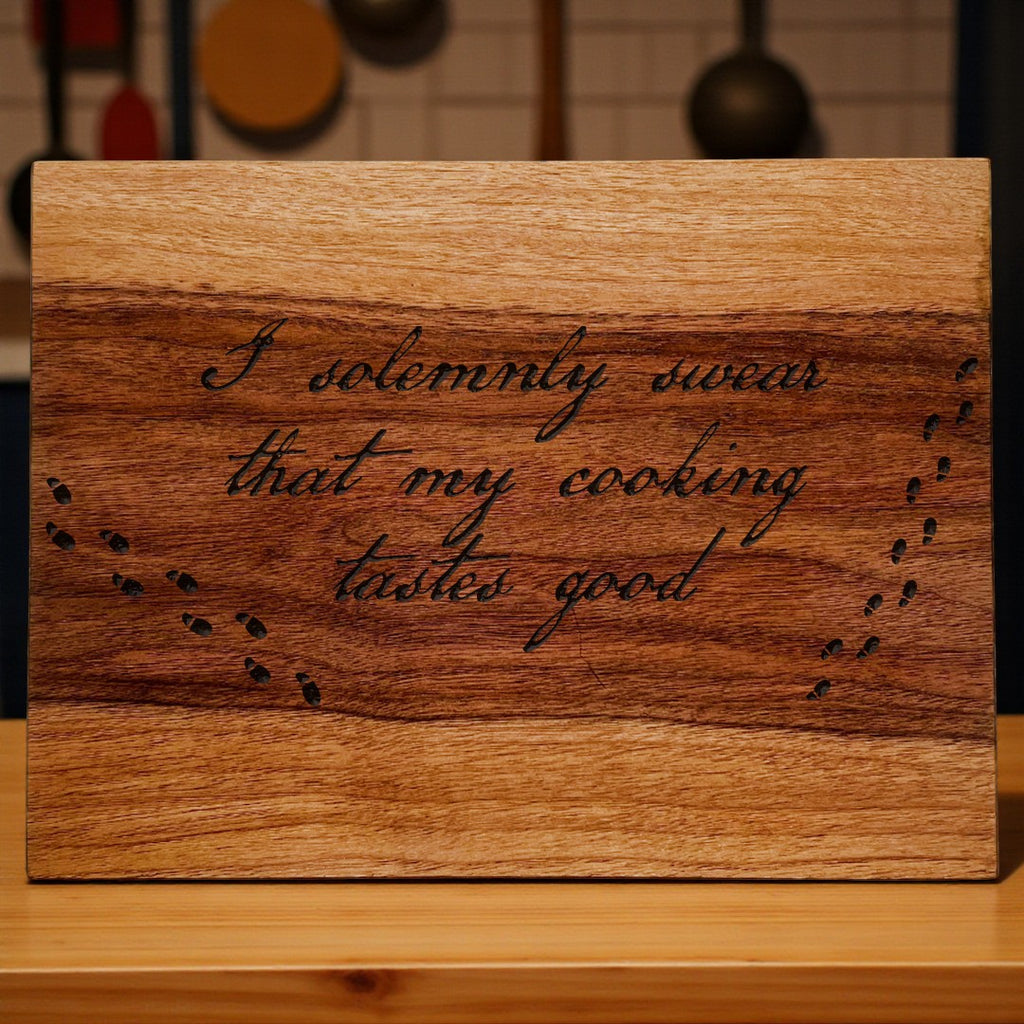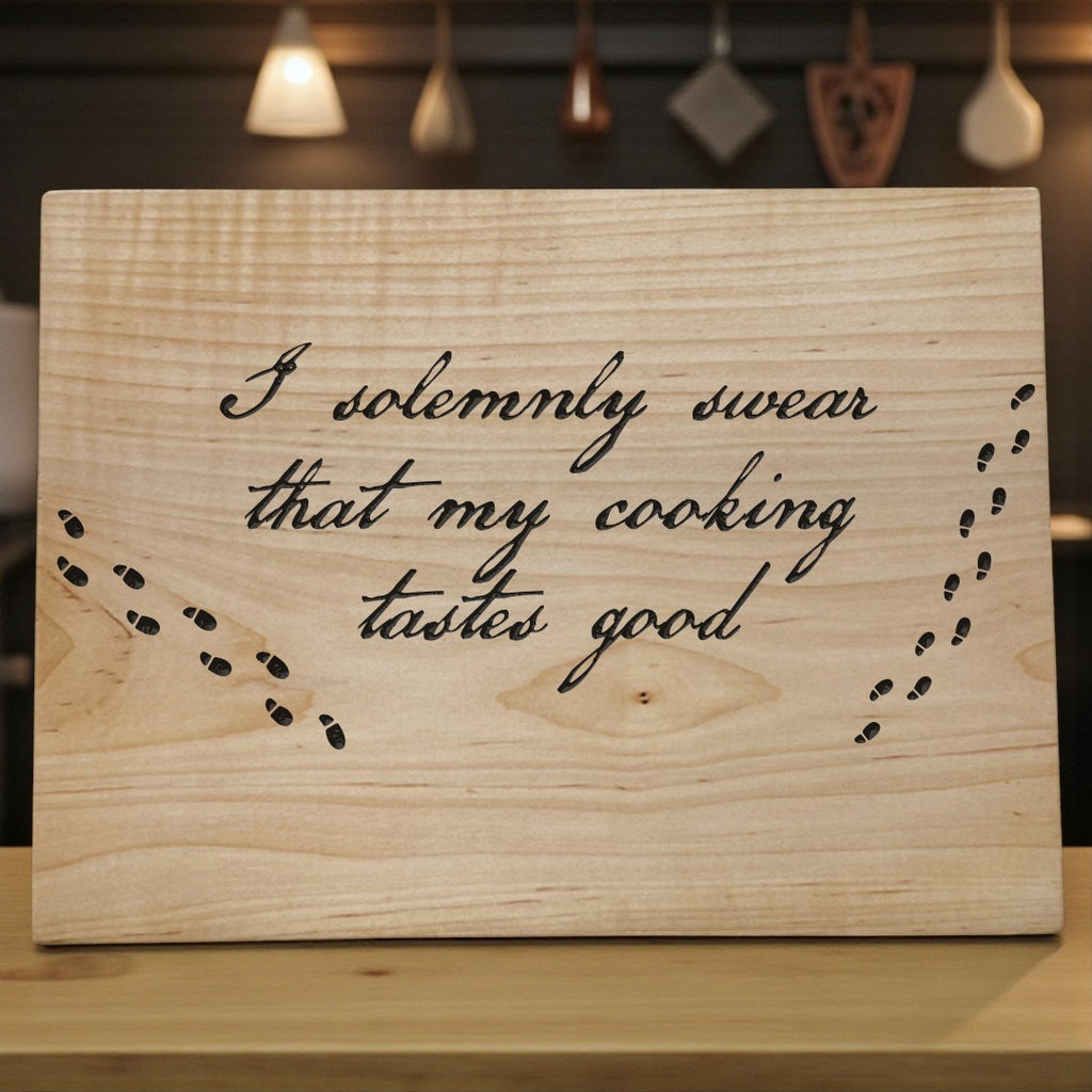 Step into the spellbinding world of culinary creativity with A Cutting Board for Your House – a whimsical tribute to the kitchen wizards among us. Featuring the engraved phrase "I solemnly swear that my cooking tastes good," this board adds a playful touch of magic to every meal you conjure.