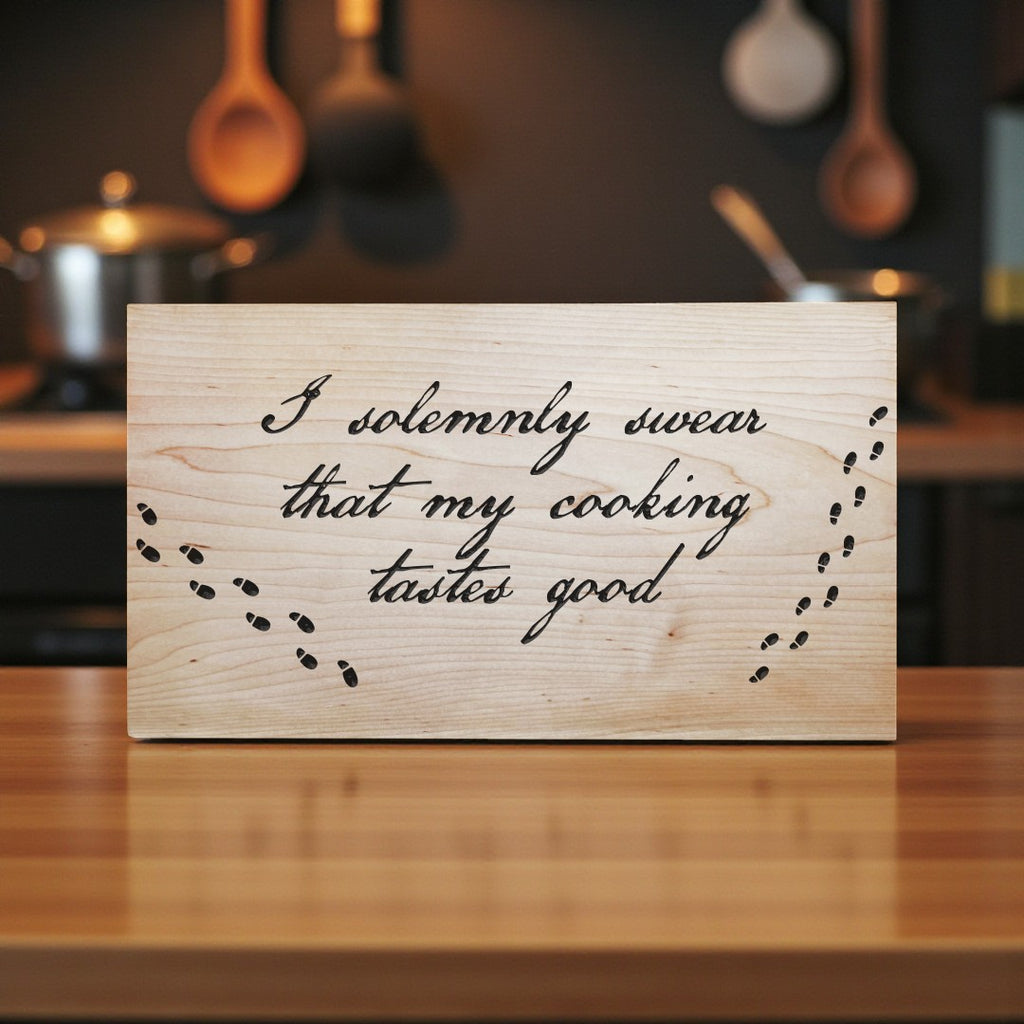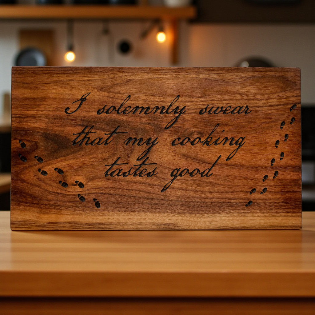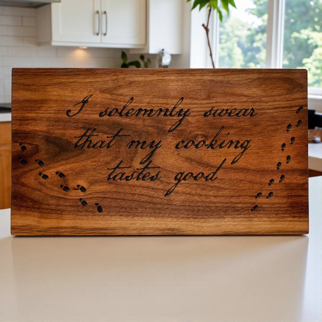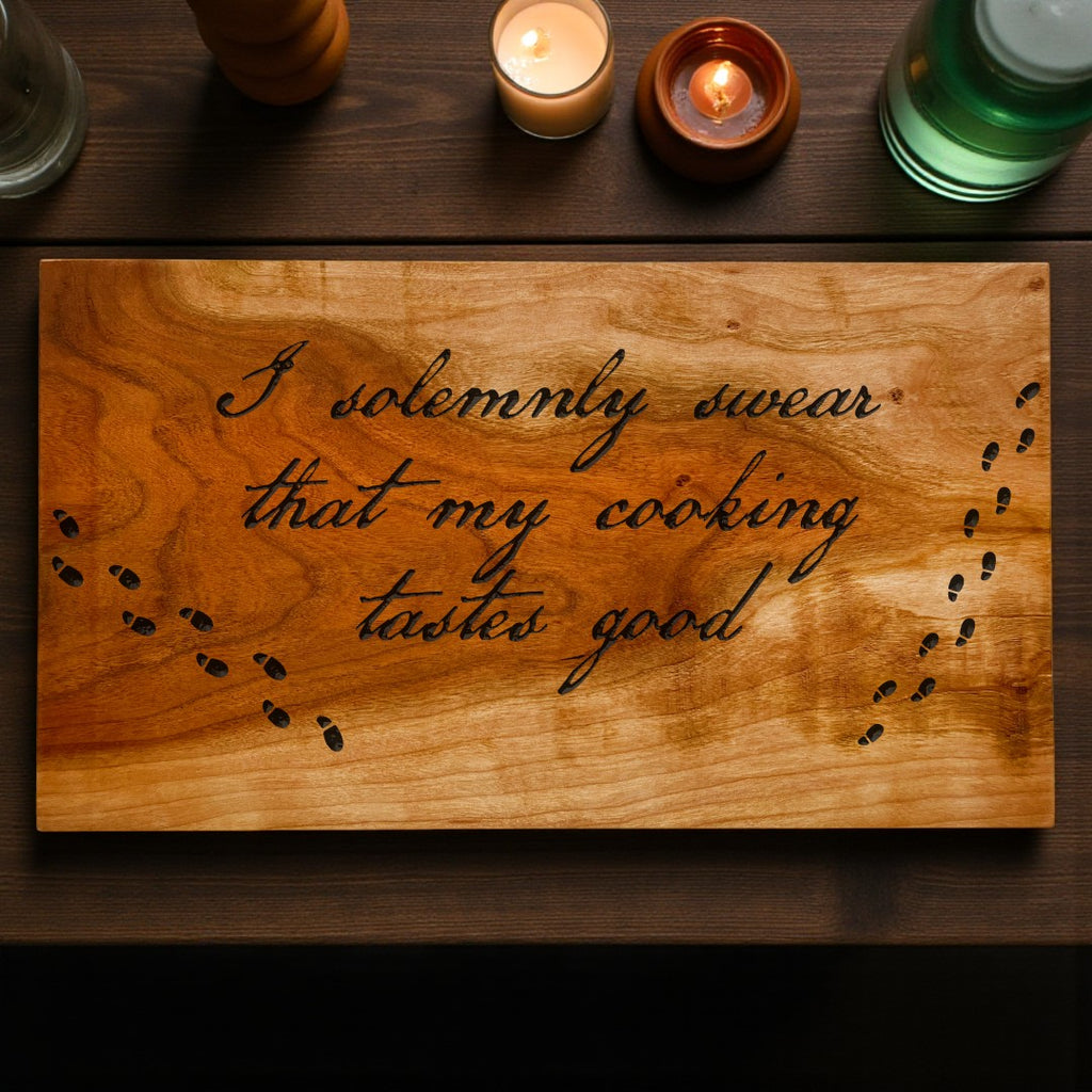Step into the spellbinding world of culinary creativity with A Cutting Board for Your House – a whimsical tribute to the kitchen wizards among us. Featuring the engraved phrase "I solemnly swear that my cooking tastes good," this board adds a playful touch of magic to every meal you conjure.