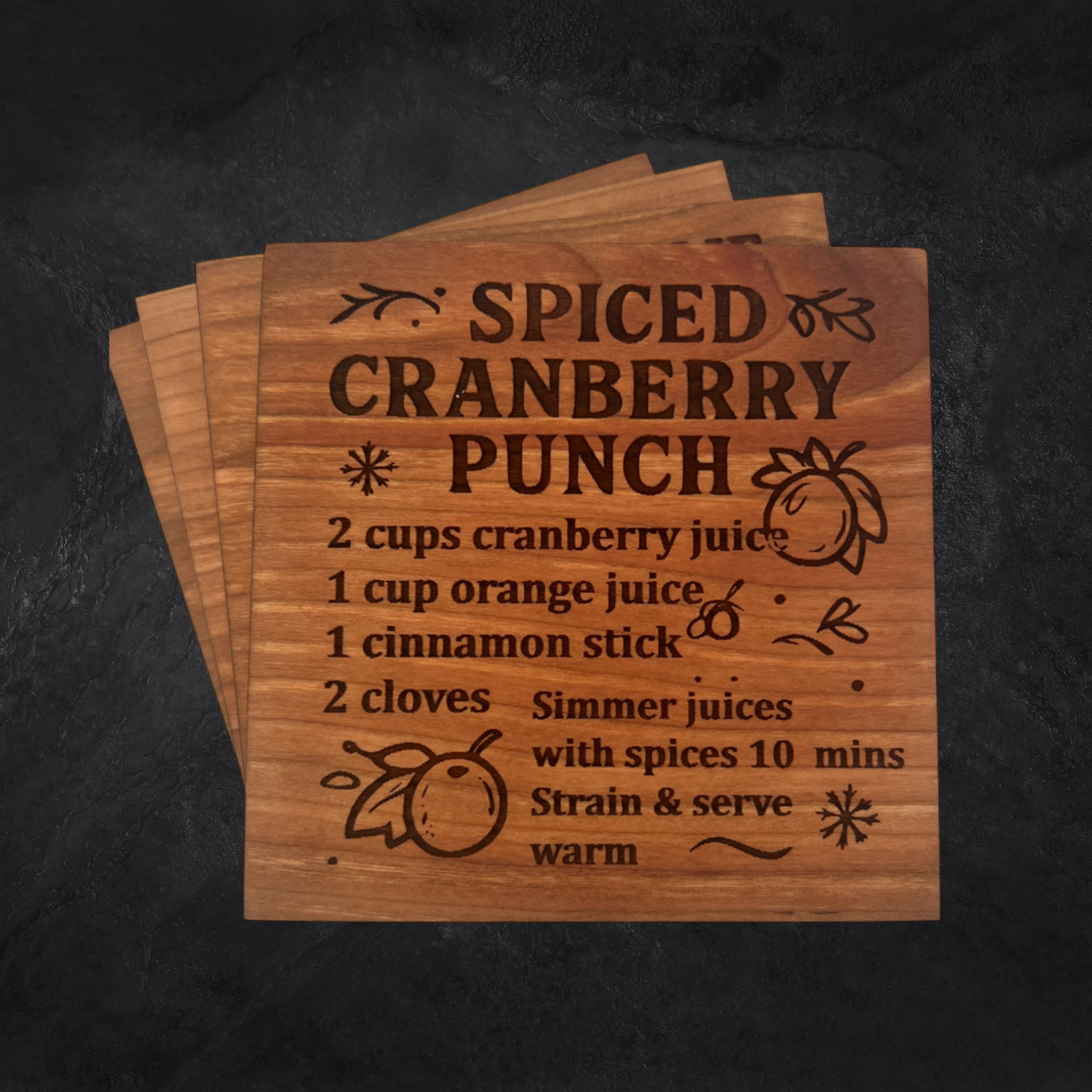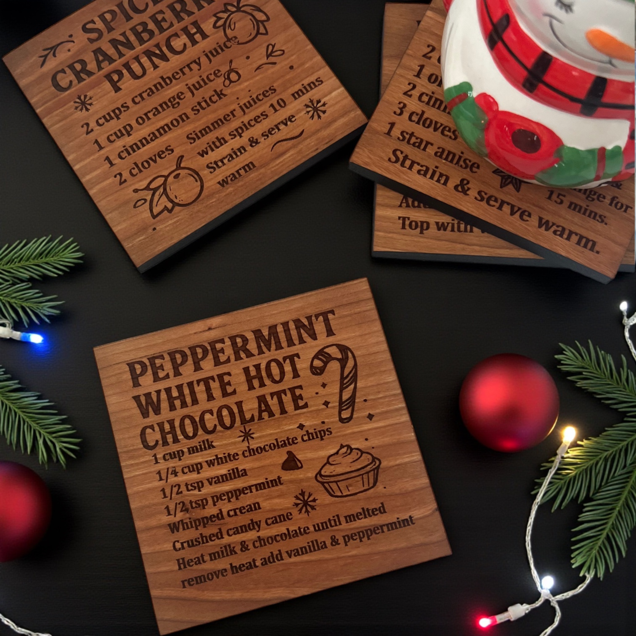 Bring warm and cozy vibes to your home with the Cozy Holiday Non-Alcoholic Recipe Coasters – a delightful collection of four engraved hardwood coasters featuring festive, family-friendly drink recipes. From movie nights to holiday gatherings, these coasters add sweetness, comfort, and seasonal charm to every mug and moment.
