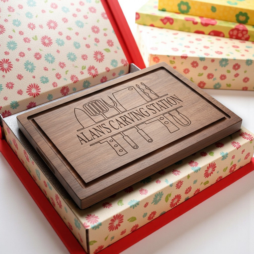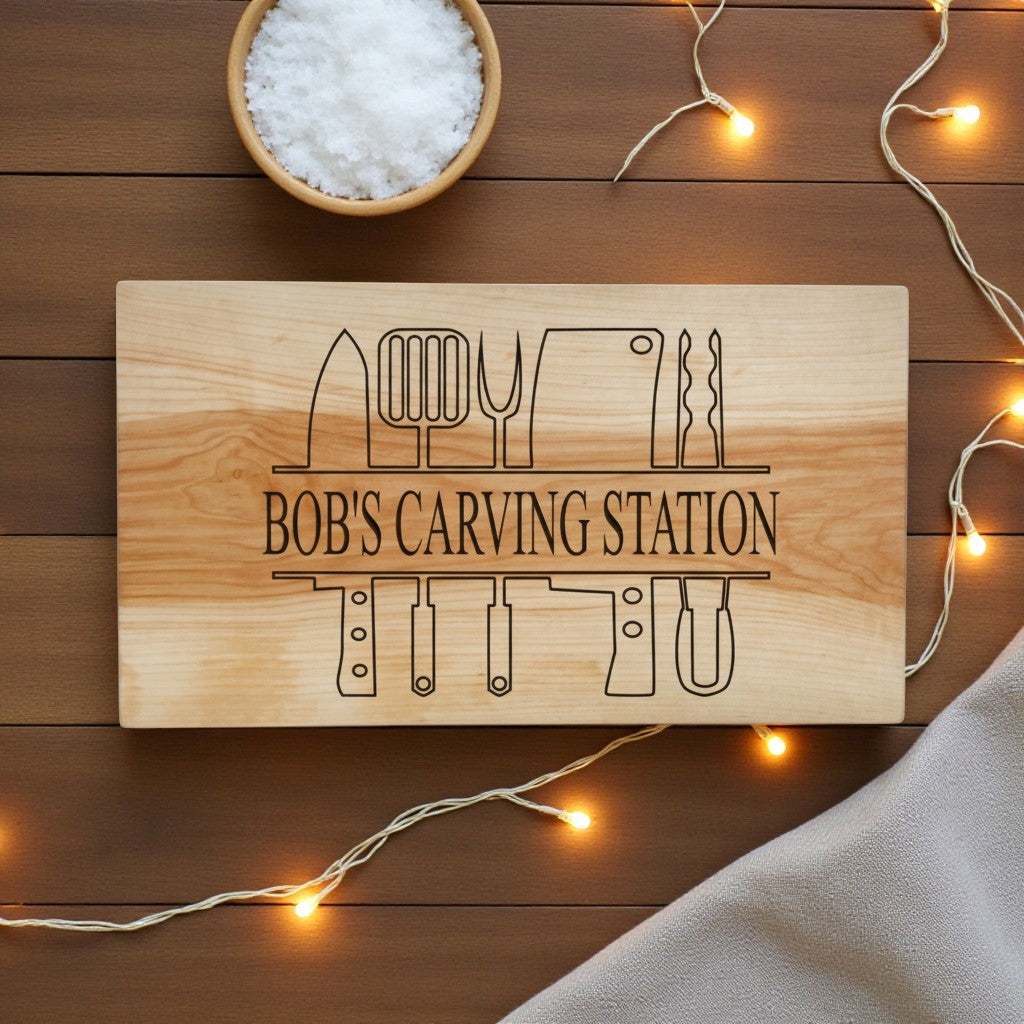 Elevate Dad's Grill Game with the Dad's Carving Station Cutting Board – the Ultimate Gift for Grill Masters, Dads, Grandpas, and More. Designed with the grill guy in mind, this cutting board brings a touch of style to every BBQ. With its unique carving station design and personalized touch, it's the perfect tribute to those who love to fire up the grill. Whether it's a gift for Dad, Grandpa, or the barbecue aficionado in your life, this board adds a dash of personality to their grilling adventures. Celebrate culinary creativity and make every BBQ a masterpiece with the Dad's Carving Station Cutting Board.