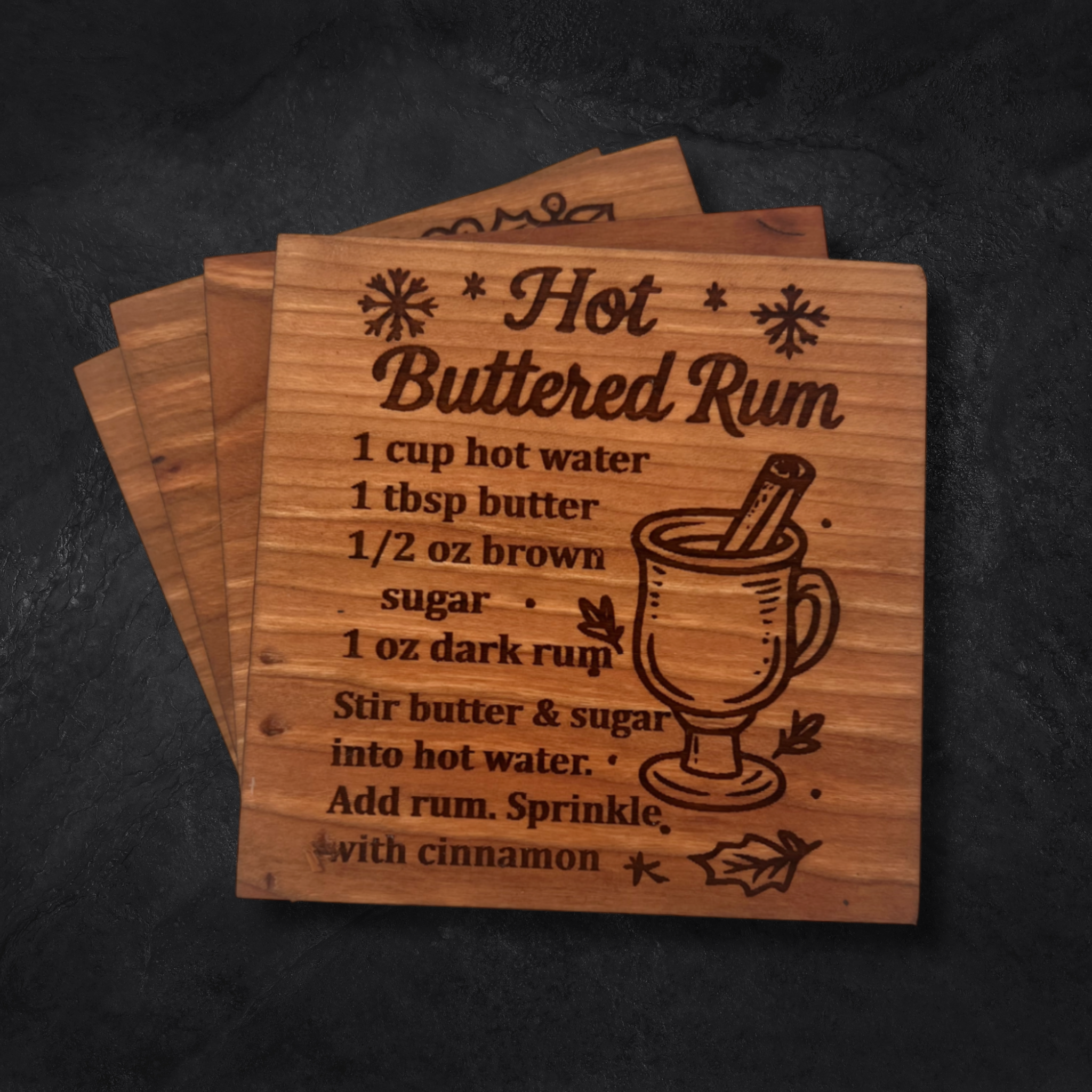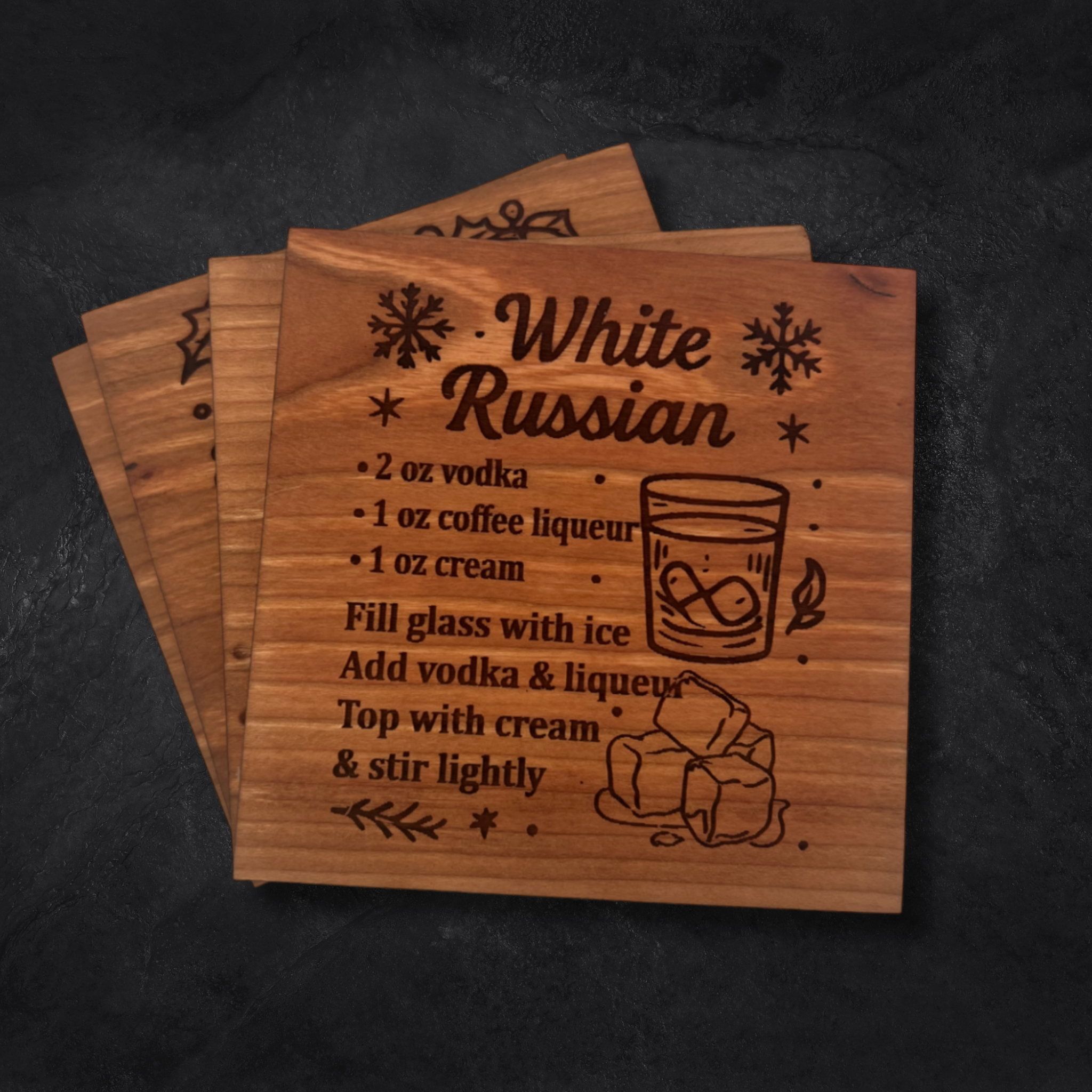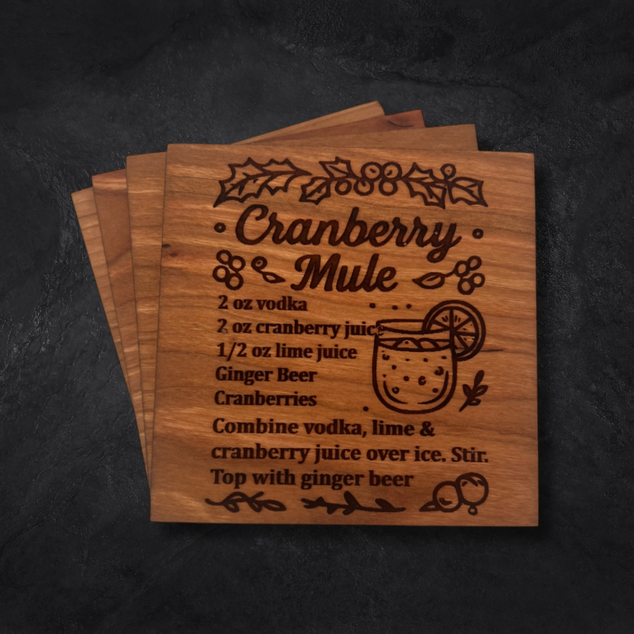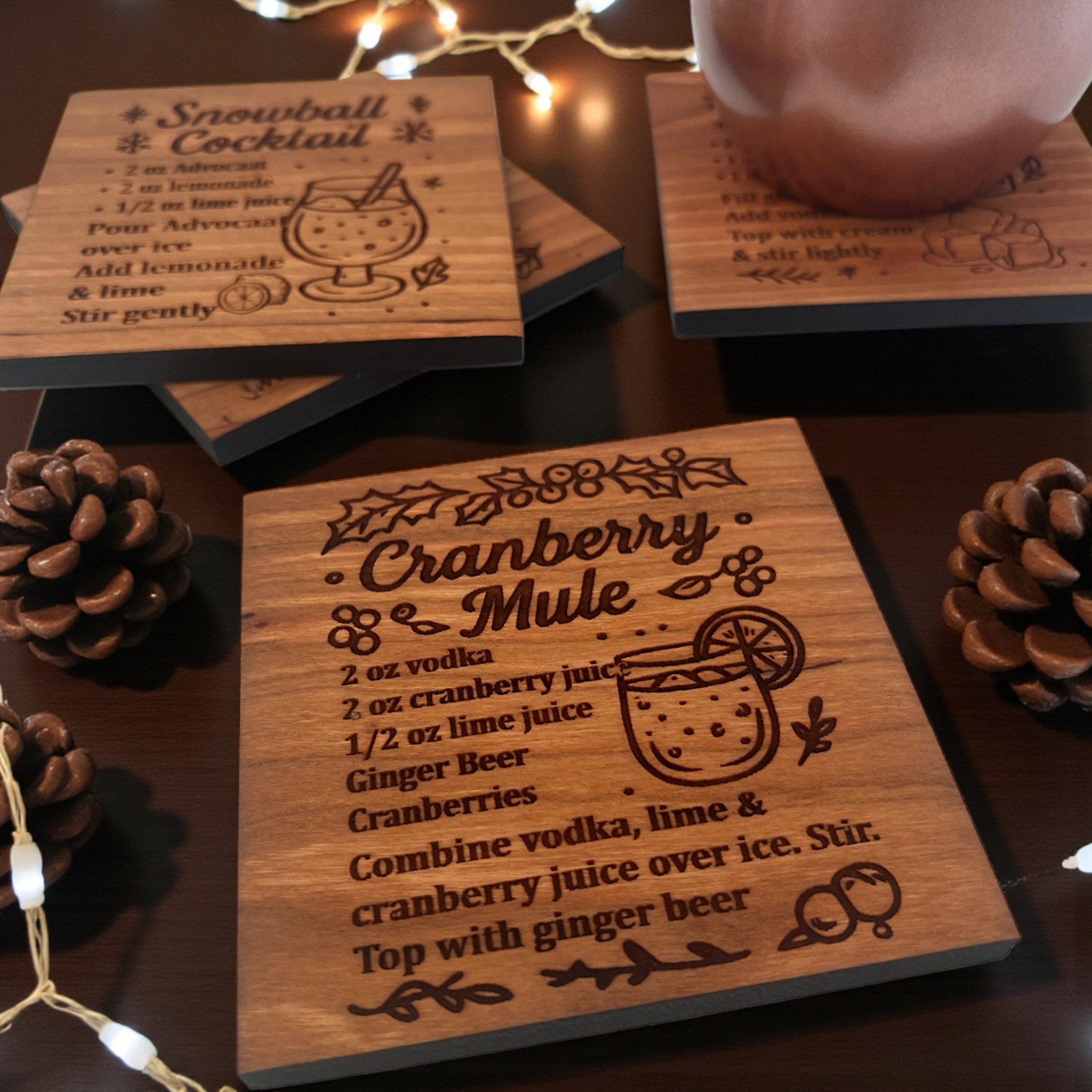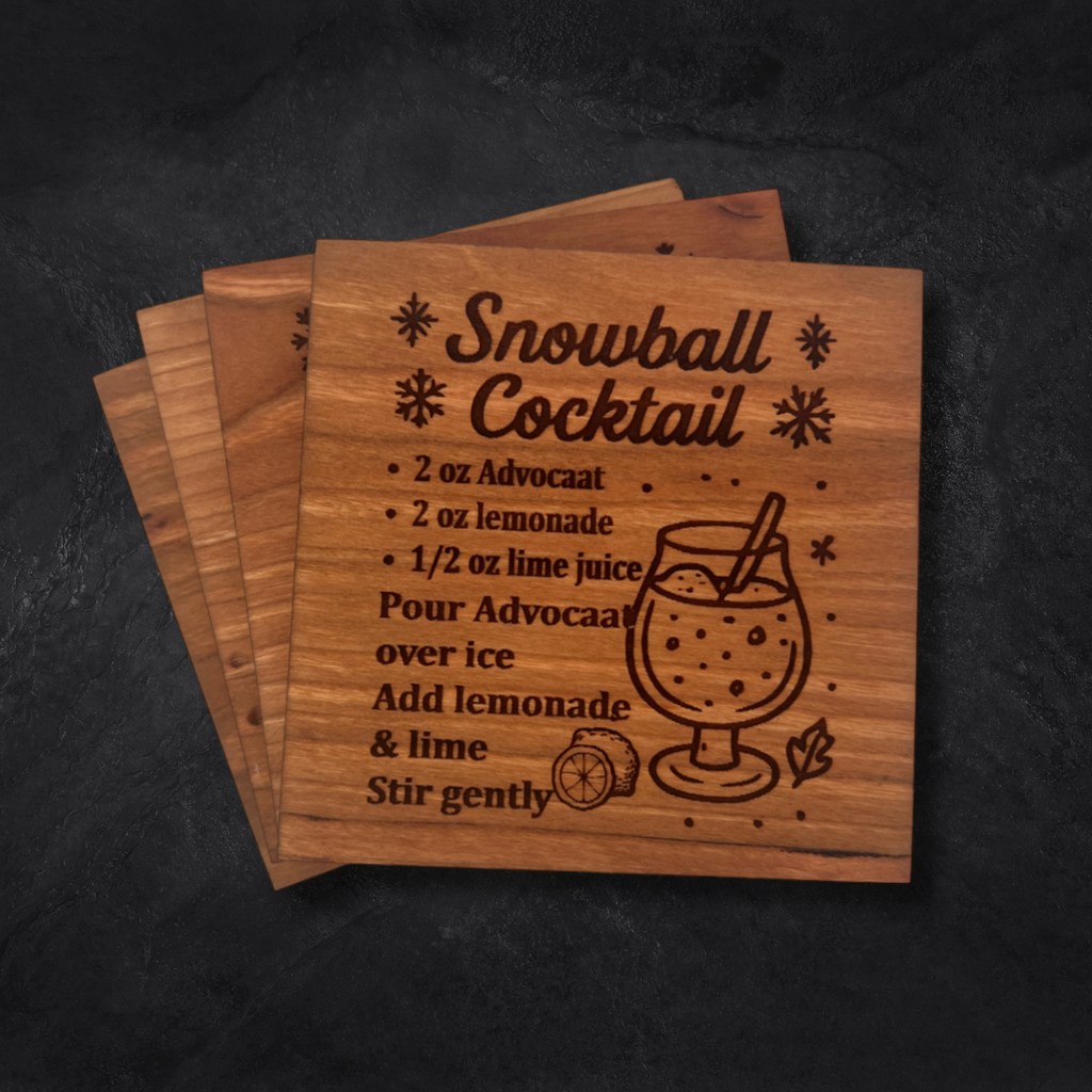 Bring holiday cheer to your table with the Festive Spirits Christmas Coasters – a festive collection of four engraved hardwood coasters, each featuring a classic Christmas cocktail recipe. Whether you're hosting a holiday party or enjoying a cozy winter night in, these coasters add seasonal flavor, charm, and merriment to every sip.